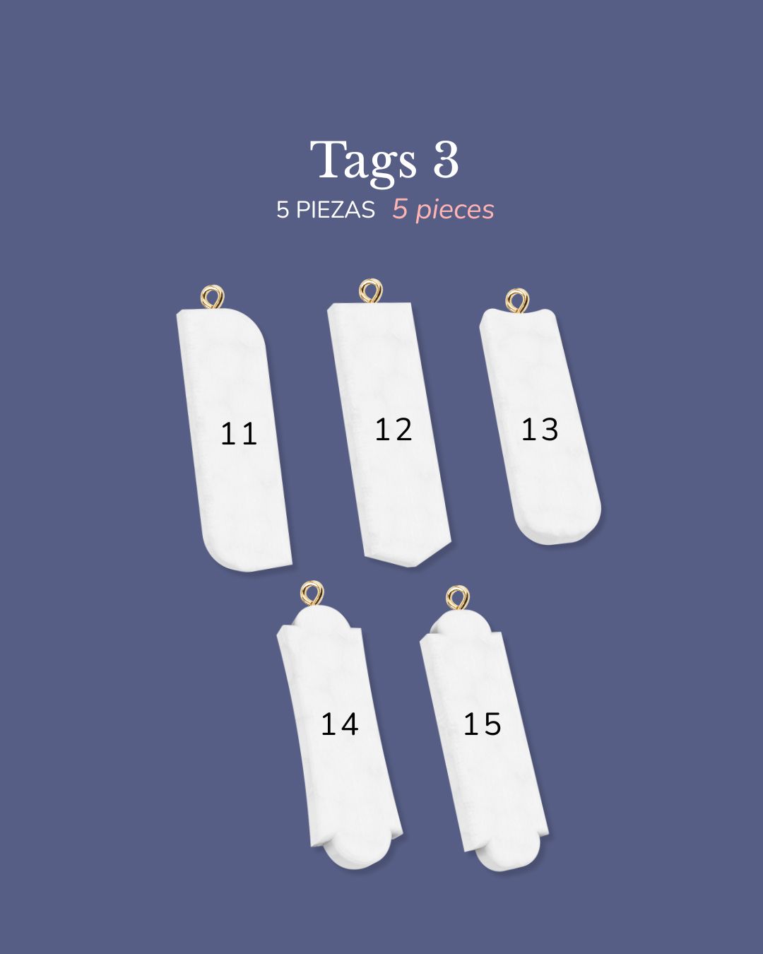 Charms rectangulares en blanco para decorar – Tags 3. Cada set incluye 5 unidades de estas tags, producidas artesanalmente y pulidas. Disponibles en tamaño de 20×8 mm para que puedas concentrarte directamente en el diseño, el color y los acabados.