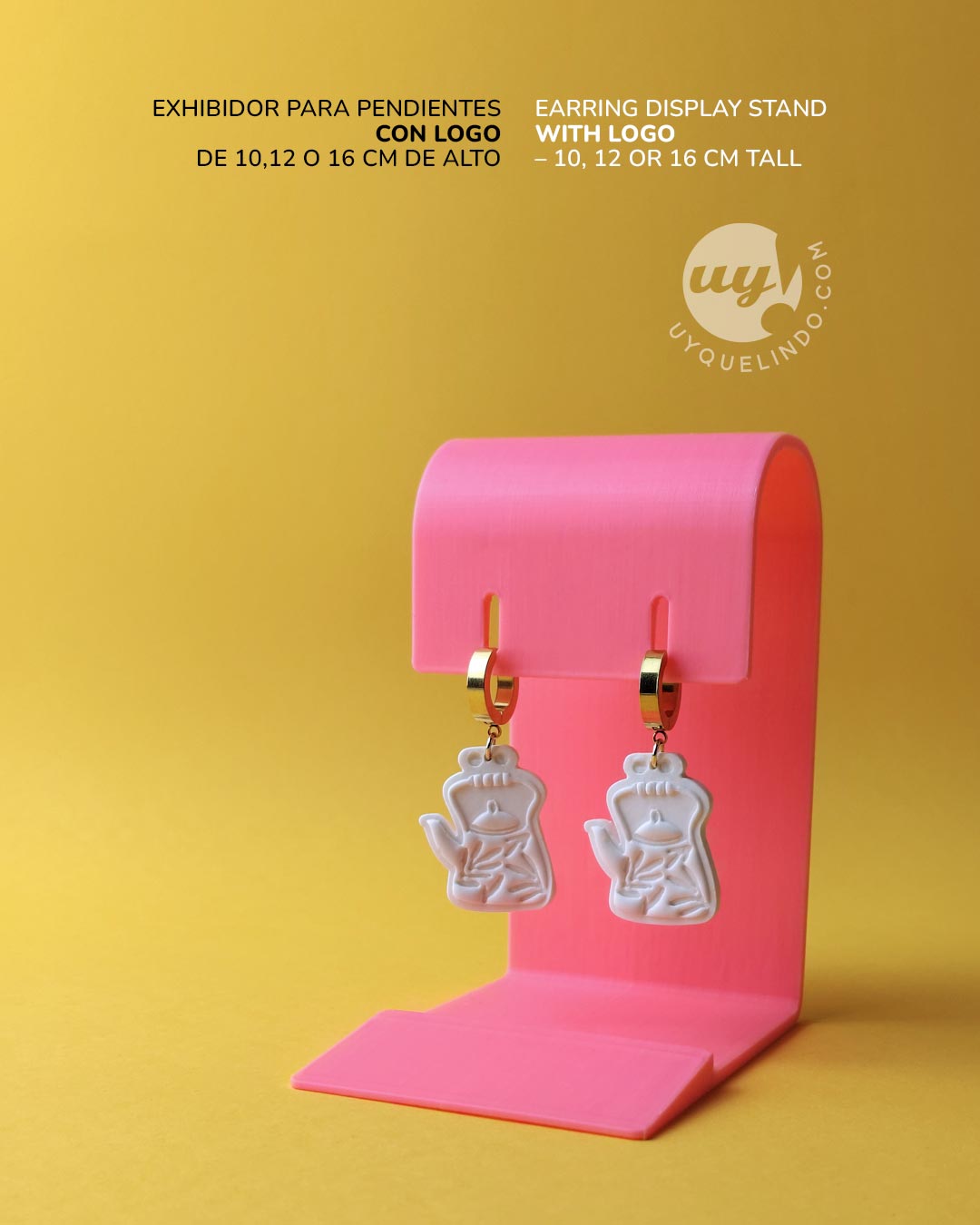 Présentoir individuel pour boucles d’oreilles personnalisé avec votre logo, fabriqué en Espagne avec des filaments premium. Disponible en 10, 12 ou 16 cm de hauteur et personnalisable en 10 couleurs. Idéal pour mettre en valeur vos bijoux sur un comptoir, lors de salons ou en vitrine. Choisissez la couleur, la taille et la quantité.