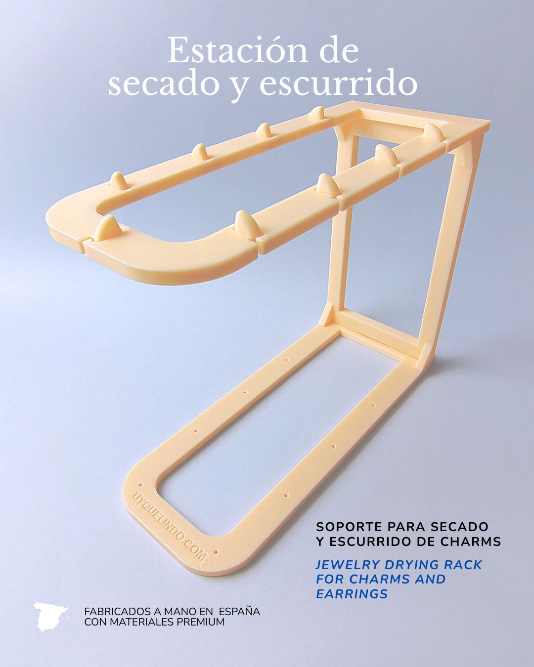 El escurridor y soporte de secado para pendientes y charms es un soporte especial para piezas pequeñas ya cocidas de arcilla polimérica, porcelana fría y otros materiales moldeables. Permite colgarlas mientras el acabado cura, evitando marcas, acumulaciones y deformaciones.